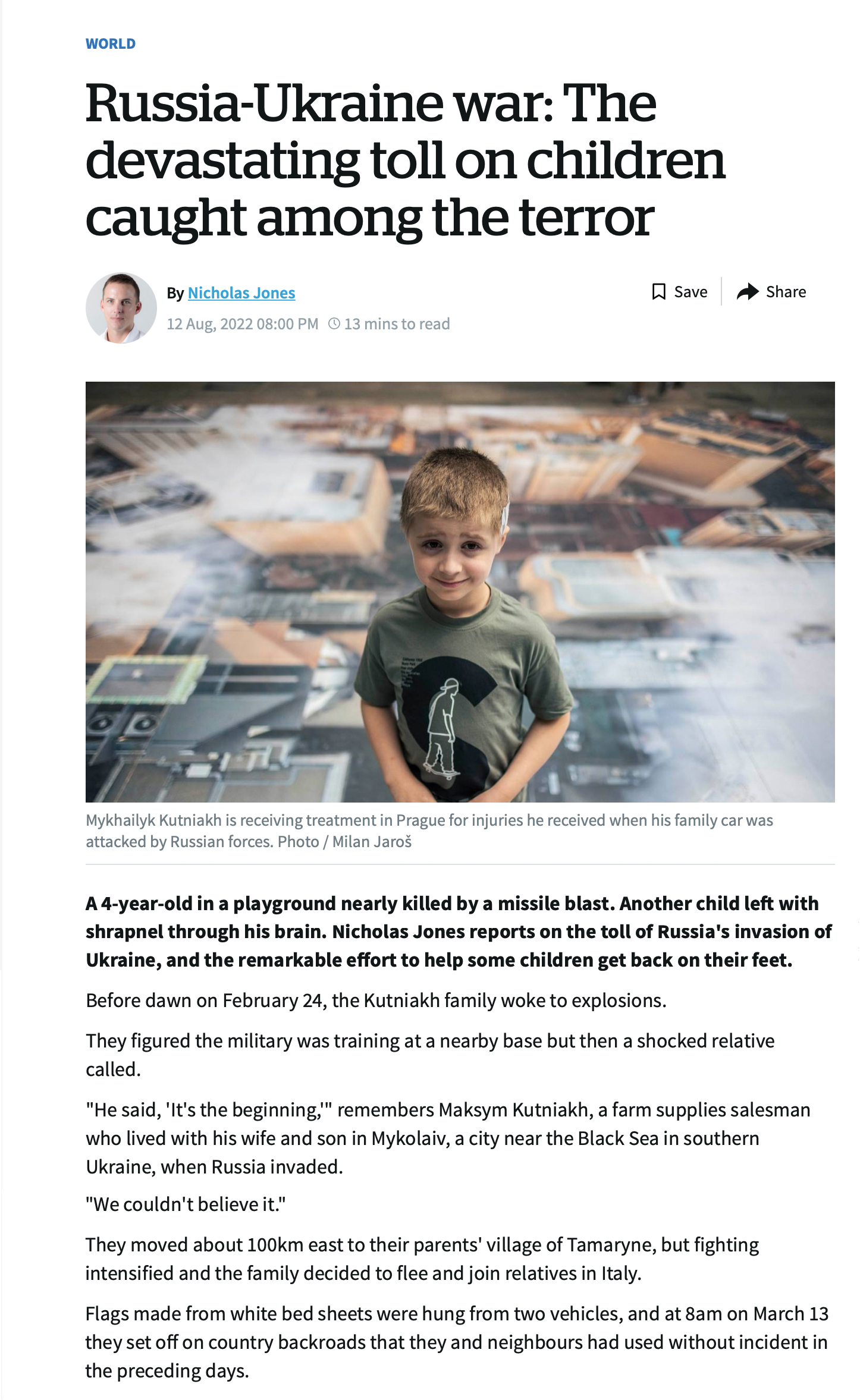 Історії сімей, де постраждали діти в наслідок російської агресії проти цивільного населення України. Із жахливими подробицями розбирався журналіст Ніколас Джонс.